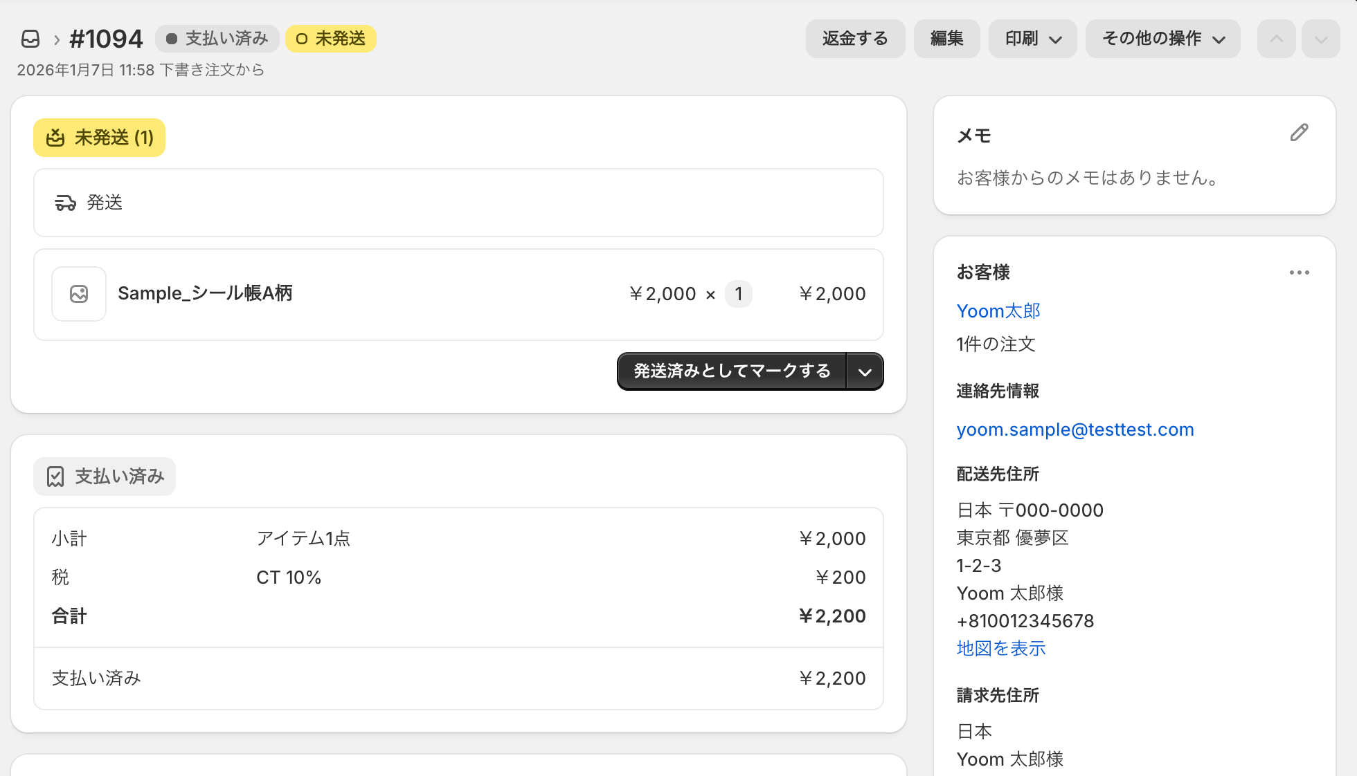 設定が完了したら動作確認のためにテストを行いますので、Shopifyに注文情報を作成しましょう。
