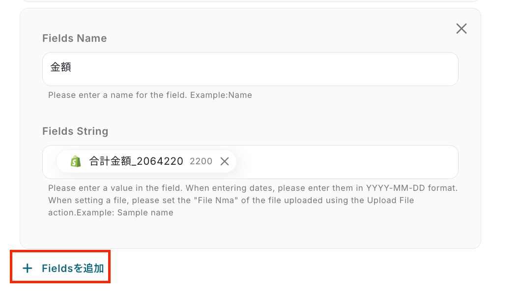 追加するデータの項目を追加したい場合は、「+Fieldsを追加」をクリックすると設定欄が増えるので、フローで使用するデータベースに合わせてご活用ください。