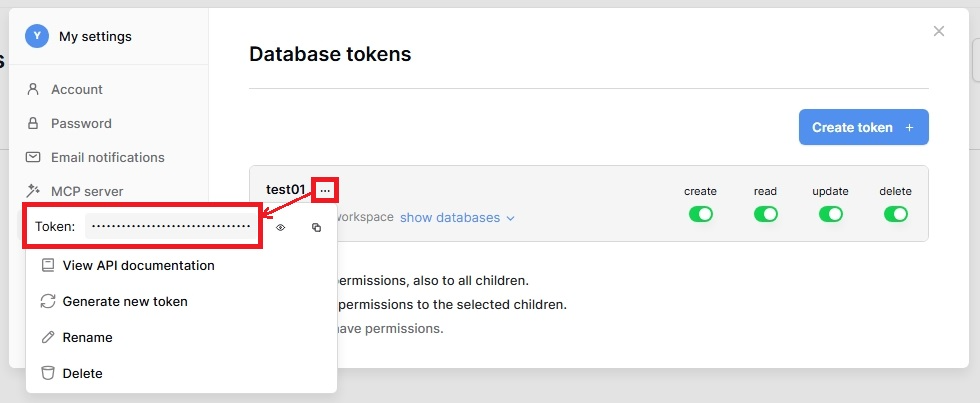 アクセストークンはBaserowの「Database tokens」画面で、下図赤枠の「…」をクリックすると表示されます。 表示された値をコピーしてYoomのマイアプリ登録画面に戻り、「アクセストークン」欄に貼り付けてくださいね!