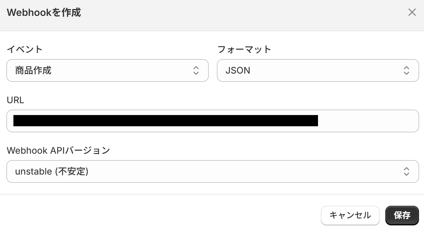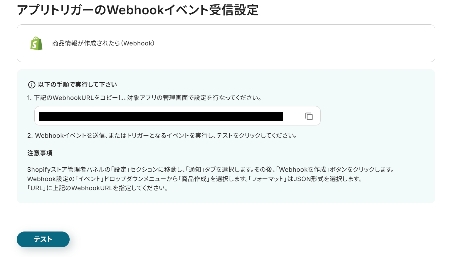 Webhook URLをコピーした後、Shopifyの画面で設定を行います。
