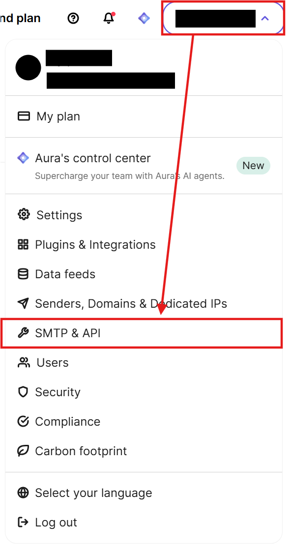 アクセストークンは右上のアイコンをクリック→SMTP & APIに進みます。