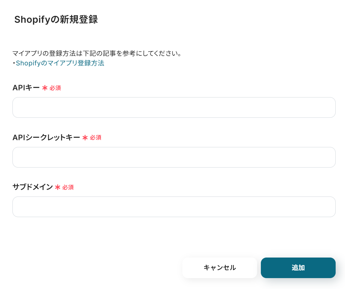 - Shopifyのアクション設定では、顧客情報を登録したいストアのサブドメインを任意で指定することが可能です。複数のストアを運営している場合でも対応できます。