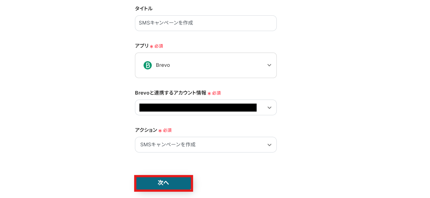 - 最後に、オペレーションでBrevoの「SMSキャンペーンを作成」アクションを設定し、キャンペーンを作成します。