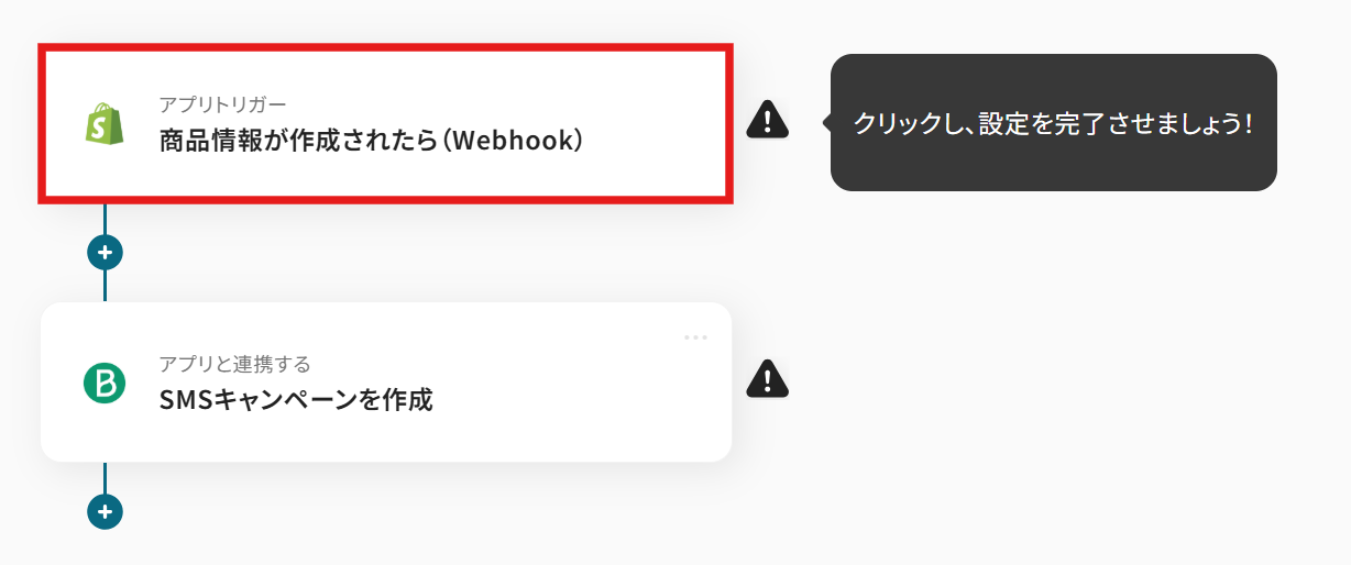 まず、一番上の「商品情報が作成されたら(Webhook)」のアイコンをクリックします。