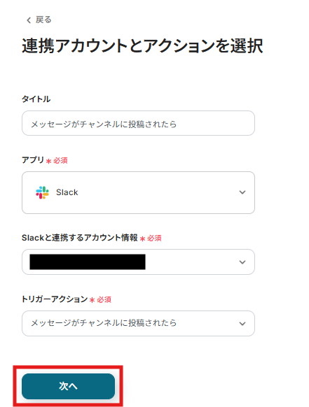 Slackと連携するアカウント情報を確認し、トリガーアクションは「メッセージがチャンネルに投稿されたら」のままで「次へ」をクリックします。