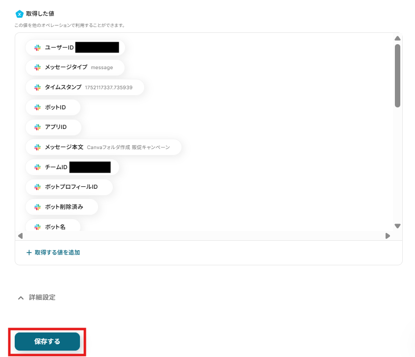 テストが成功すると、取得した値の横にSlackに送信したメッセージの詳細情報が表示されます。