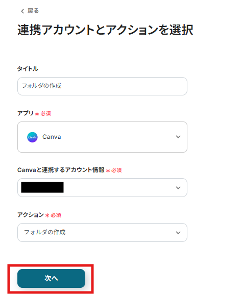 Canvaと連携するアカウント情報を確認し、トリガーアクションは「フォルダの作成」のままで「次へ」をクリックします。