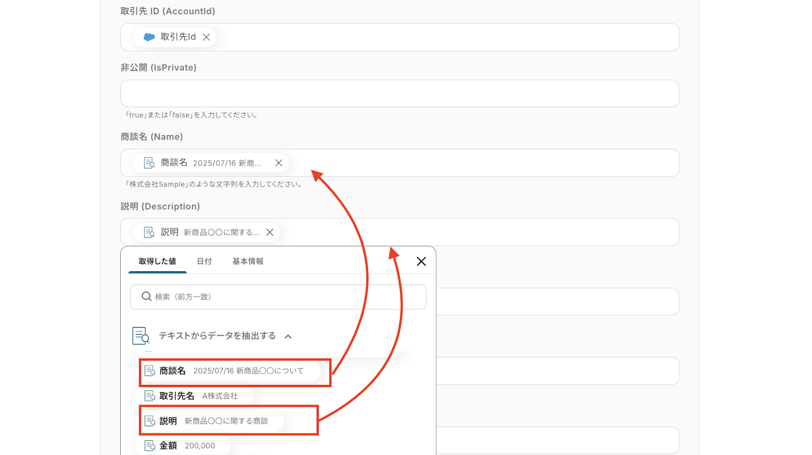今回は、「値」に抽出結果の【取引先名】を引用し設定しました。