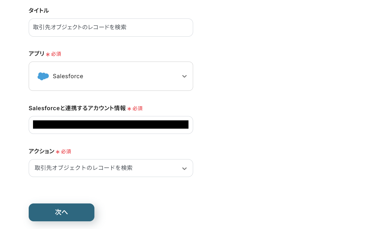 次の画面で、Salesforceの指定したテーブルに新しいレコードを追加する設定を行います。