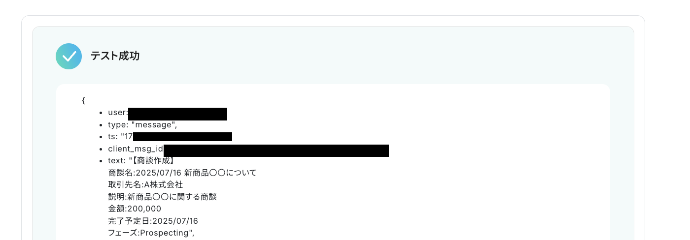 設定後、[テスト]を行います。今回は、以下のような内容をSlackに投稿してみました。