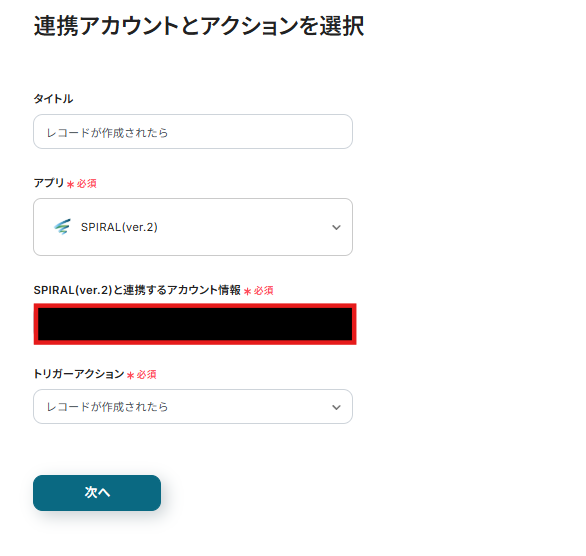 連携アカウントとアクションを選択する画面が表示されるので、今回連携するSPIRALのアカウントを確認し「次へ」をクリックします。