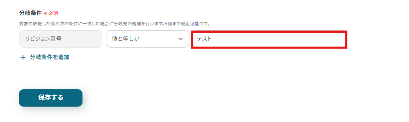 分岐条件の赤枠の箇所に、特定の条件となる内容を入力しましょう。
