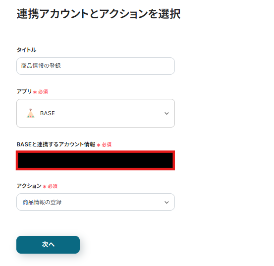 連携アカウントとアクションを選択する画面が表示されるので、今回連携するBASEのアカウントを確認し「次へ」をクリックします。