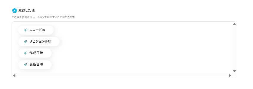 テストが成功しても自動で項目が表示されない場合は「+取得する値を追加」をクリックして回答データを取得しましょう。