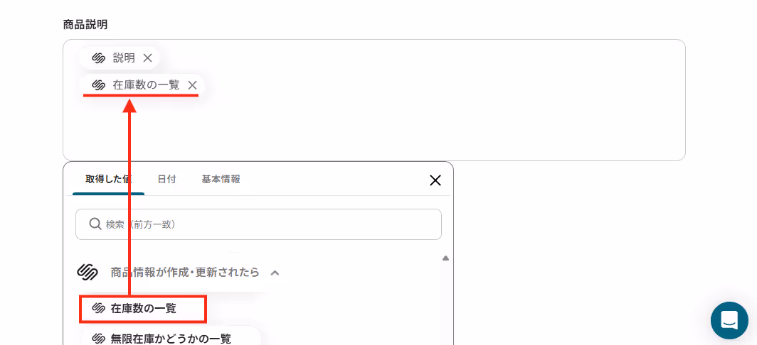 例えば、ステップ5で商品説明の欄を設定する際に取得した値から「在庫数の一覧」を選択することで、Squarespaceの在庫数も同期することができます。