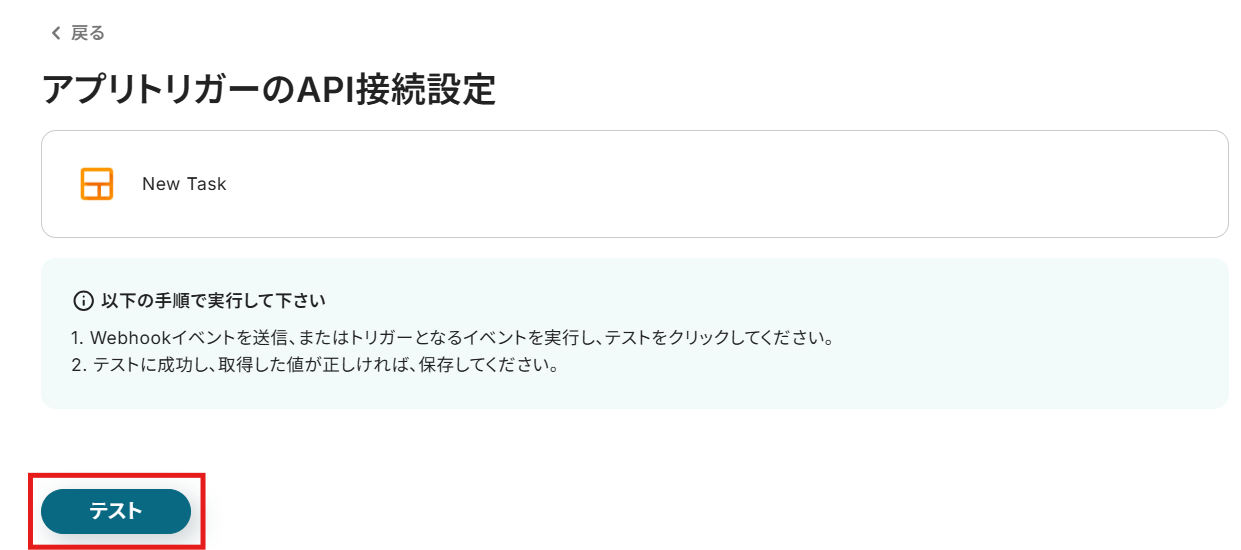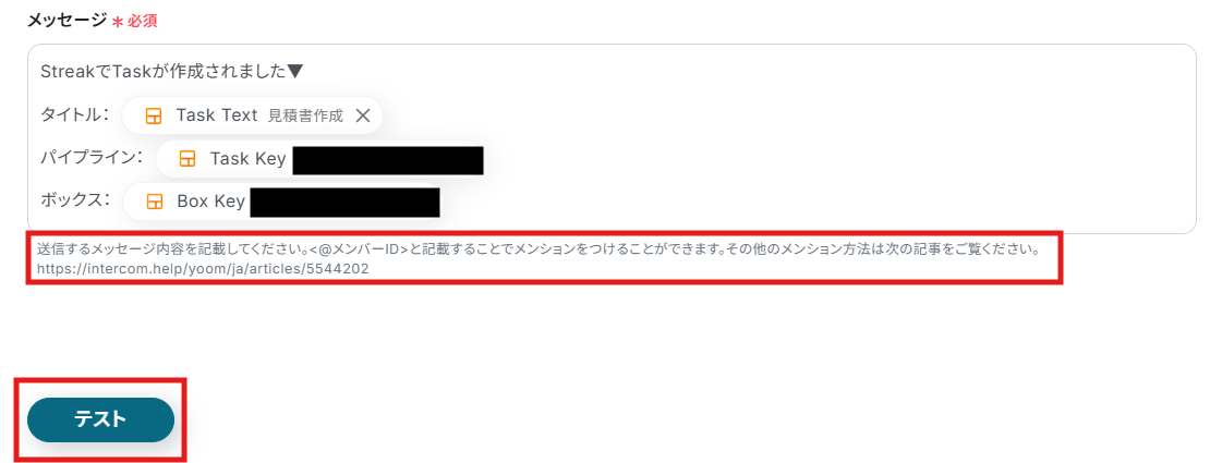 Streakにタスクが作成できたら、Yoomに戻り「テスト」をクリックします。