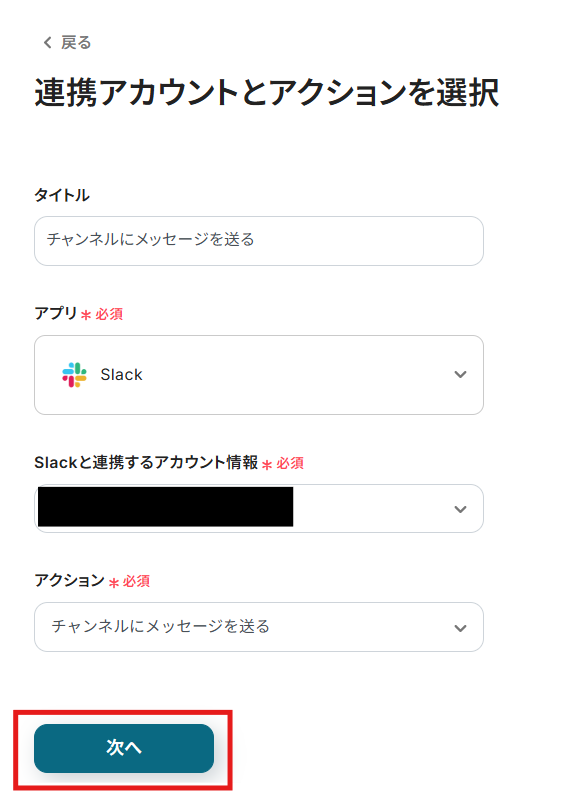 Streakと同様に、ステップ1でマイアプリ連携したSlackのアカウント情報が自動で表示されます。