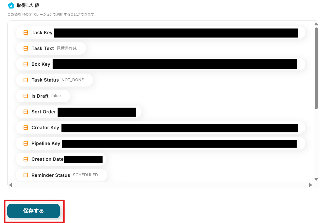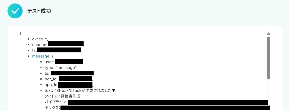 テストが成功すると、取得した値の横に、Streakで作成したタスクの詳細情報が表示されます。