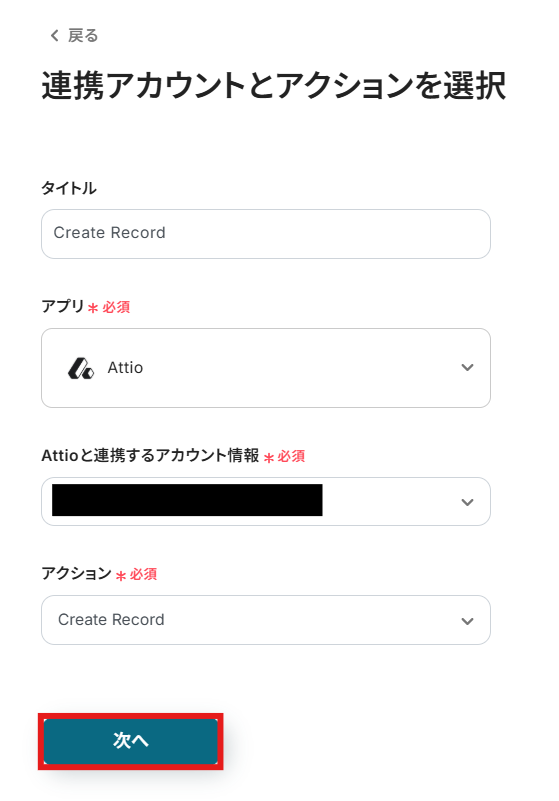 - Attioと連携するアカウント情報:フローと紐づけるアカウントを選択してください。