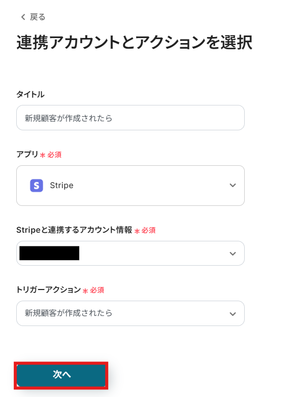 - Stripeと連携するアカウント情報:フローと紐づけるアカウントを選択してください。