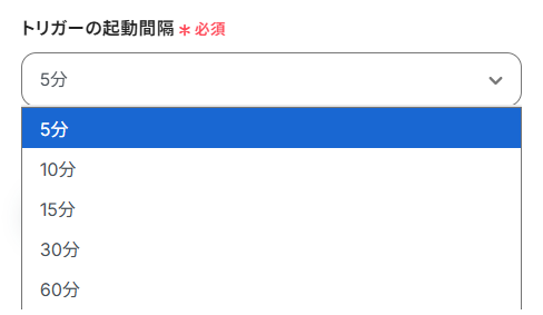 - 次の画面に表示されるトリガーの起動間隔は、5分、10分、15分、30分、60分のいずれかで設定できます。