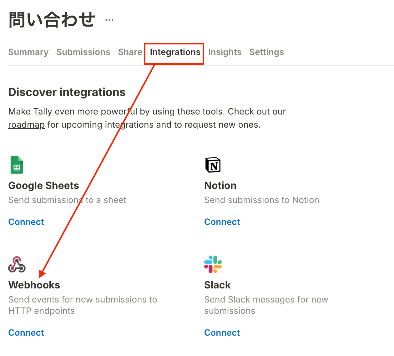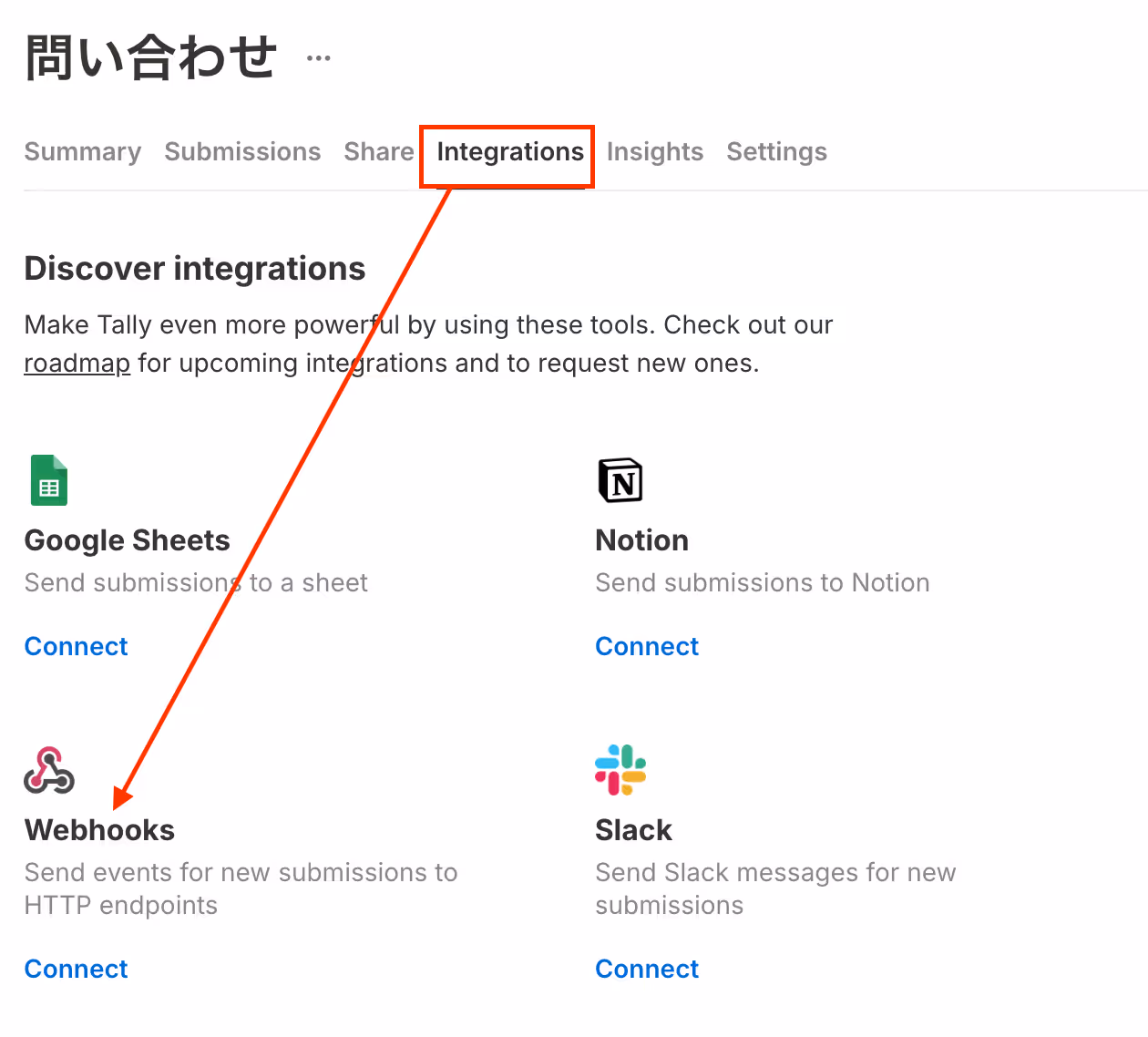 WebhookURLの設定方法は、Tallyの連携したいフォームにアクセスしてください。