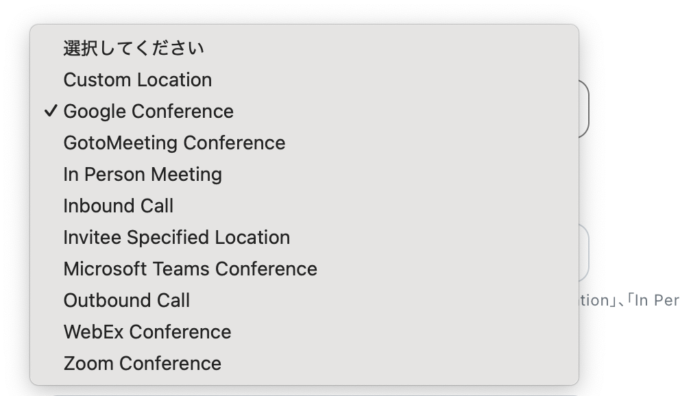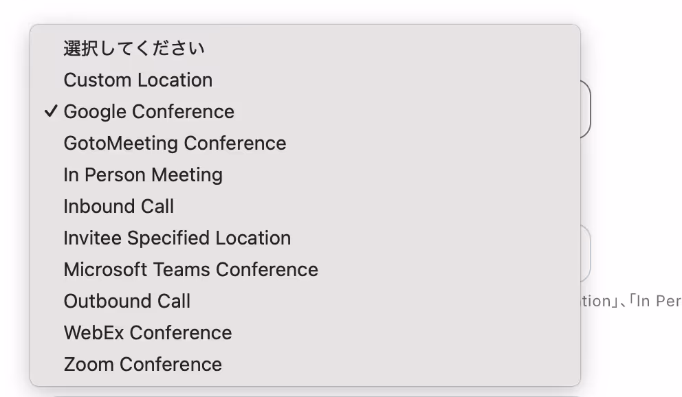 ロケーションタイプはプルダウンから選択してください。ここでは「Google Conference」を選んでいます。