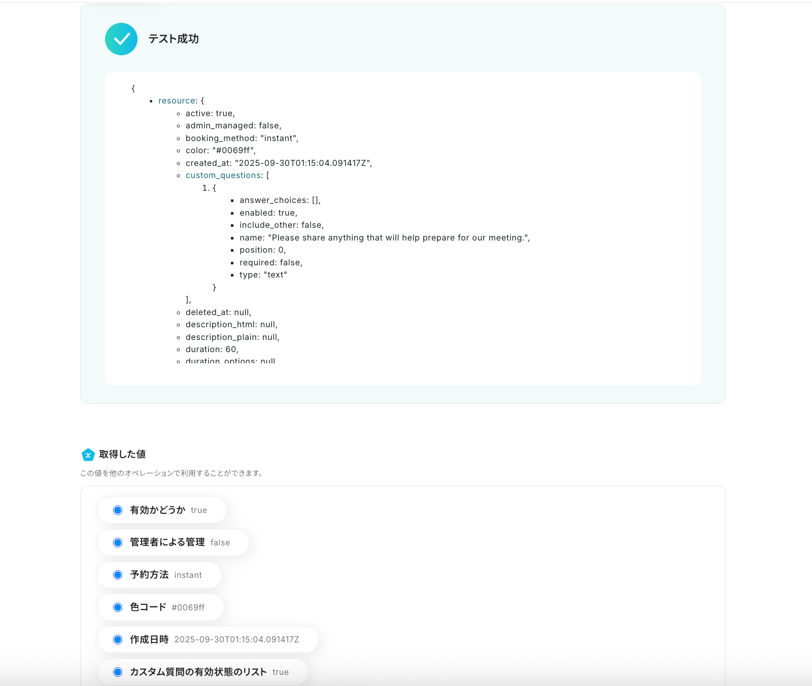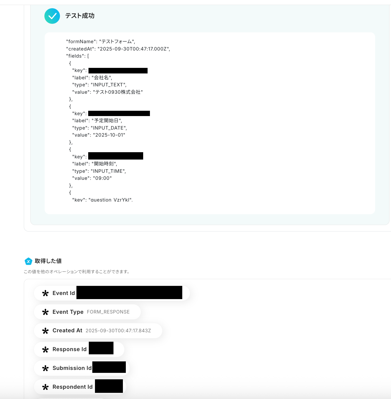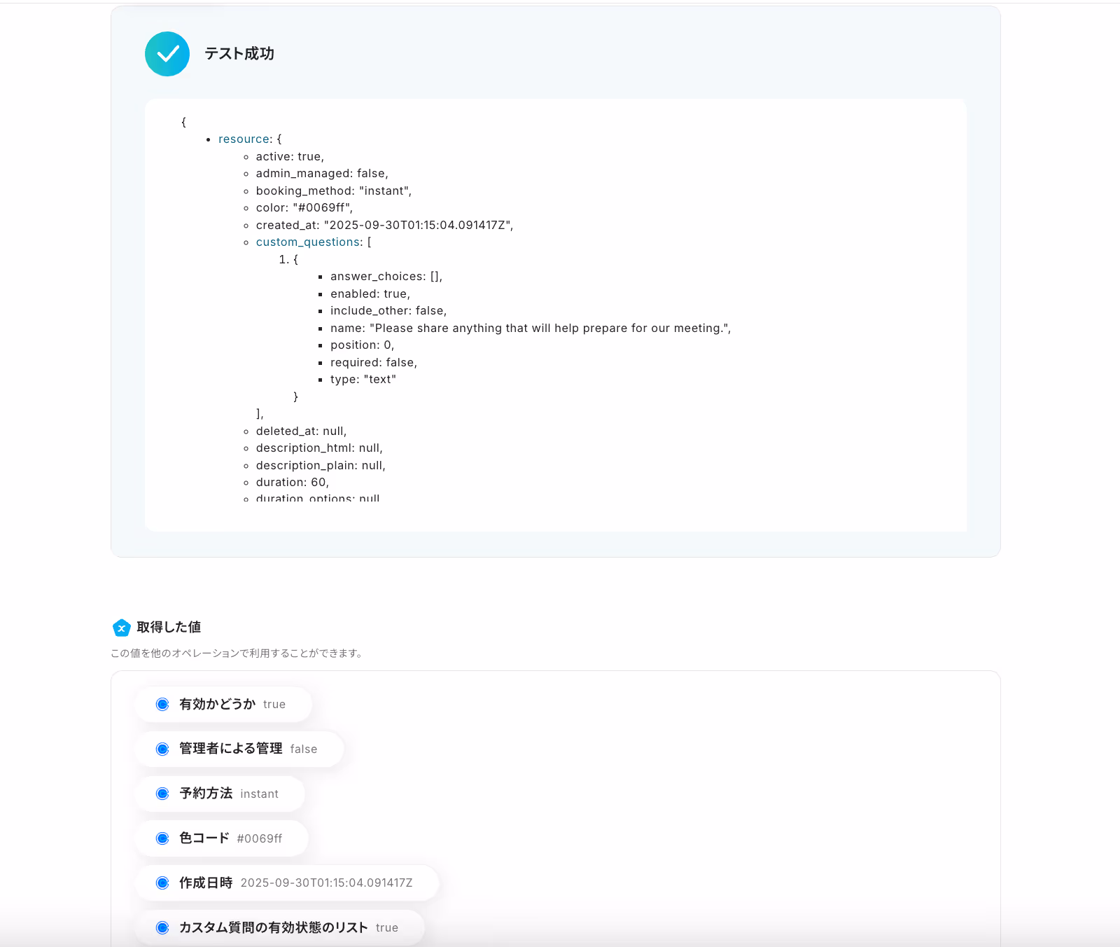 トリガーを実行できたら、Yoomに戻ってテストをクリックしましょう。テストが成功し、取得した値に情報が追加できます。