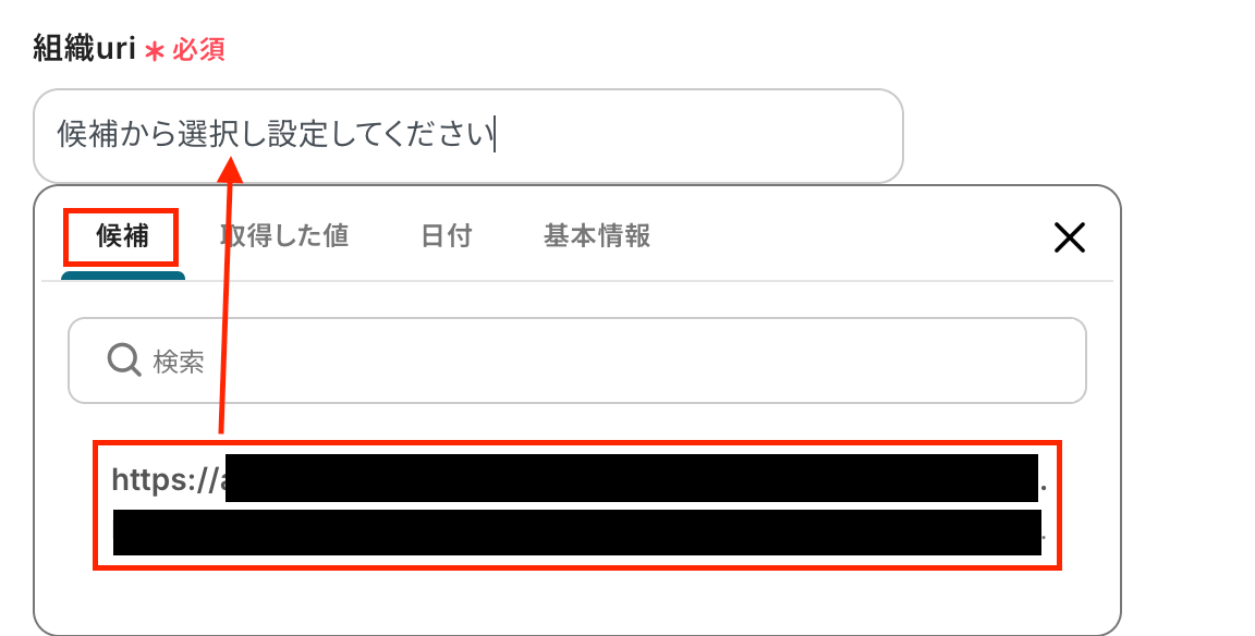 組織uriは候補に表示される中から選択してください。