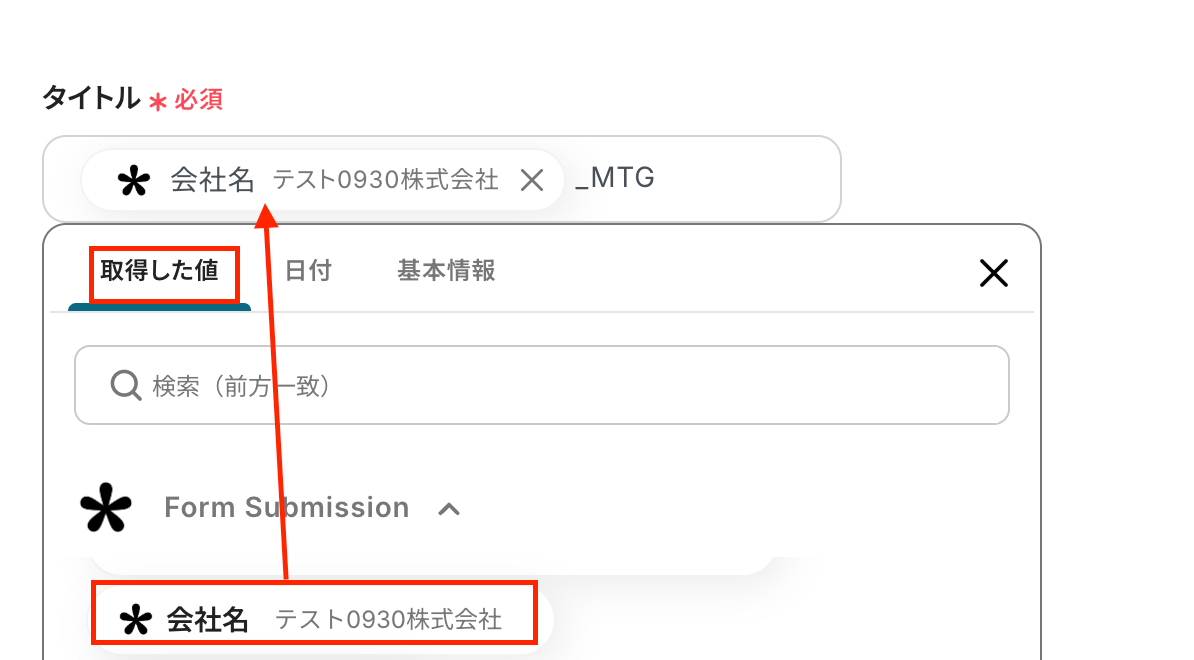 タイトルは添付画像のように、Tallyの取得した値を活用してください。手動で入力すると、同じ内容が繰り返し追加され続けることになります。
