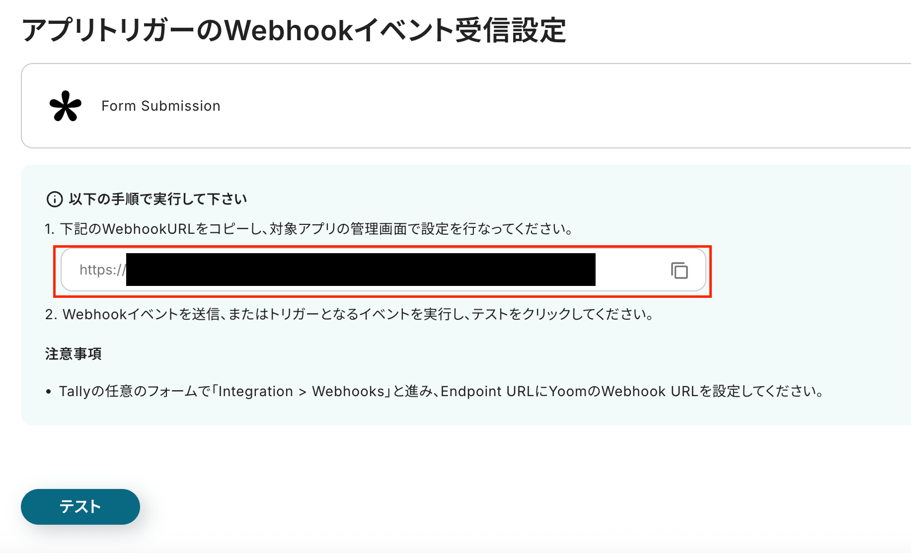 アプリトリガーのWebhookイベント受信設定に進んだら、表示されているWebhookURLをコピーして、Tallyで設定しましょう。