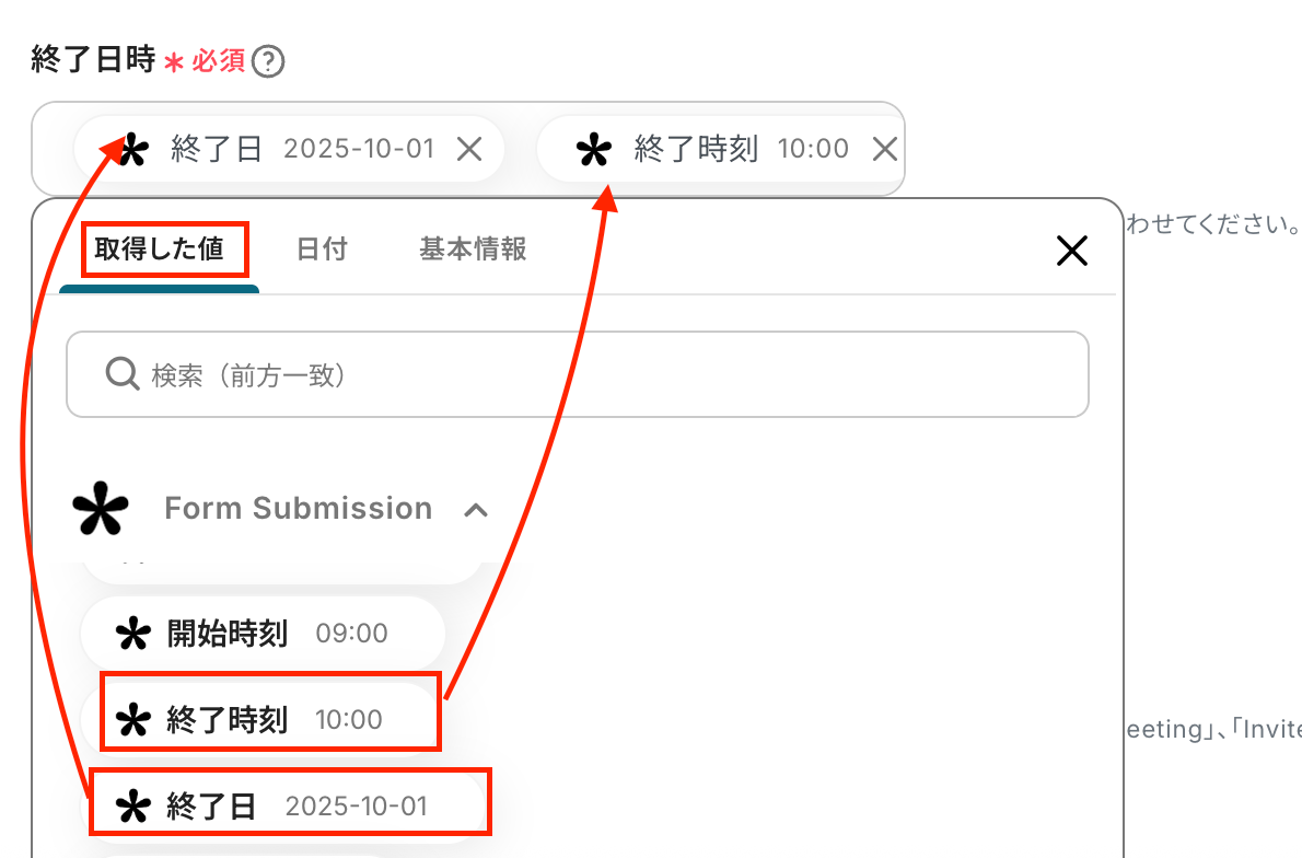 終了日時も同様に、「終了日」と「終了時刻」を選択しましょう。