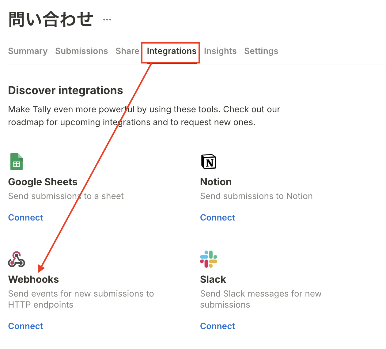 WebhookURLの設定方法については、Tallyの連携したいフォームにアクセスします。