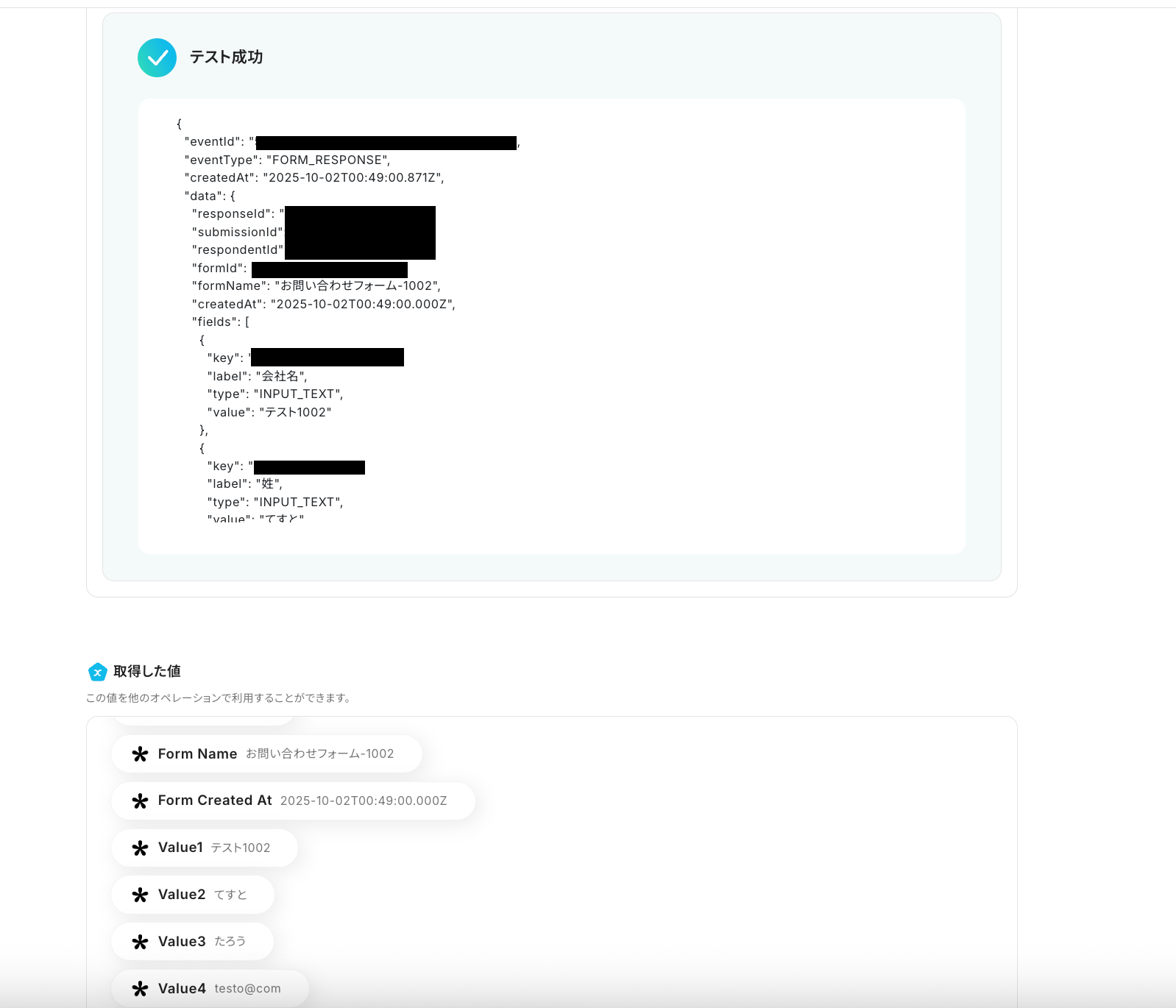 設定できたら、Tallyの連携したいフォームに回答を行い、トリガーを起動させます。
