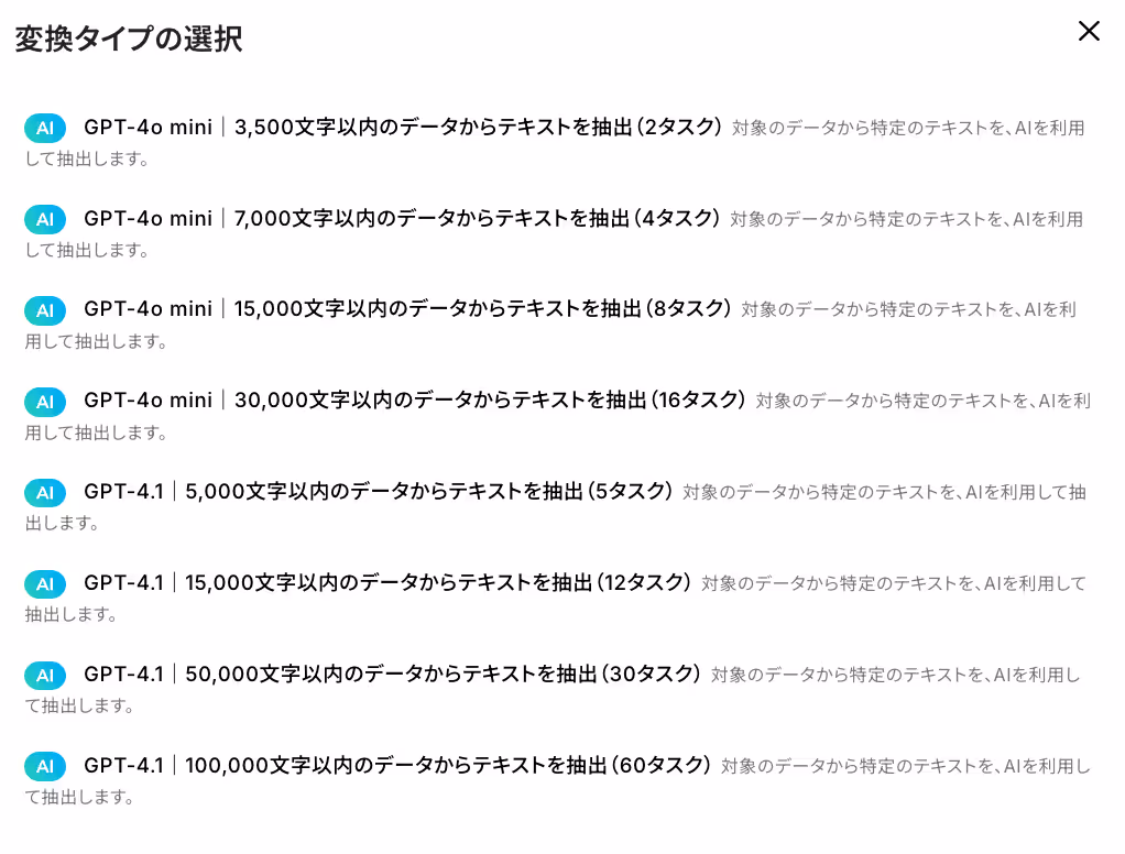 デフォルトでは「GPT-4o mini|3,500文字以内のデータからテキストを抽出(2タスク)」が設定されていますが、下図の中から選択できるので、活用シーンに合わせて自由に選んでくださいね!
