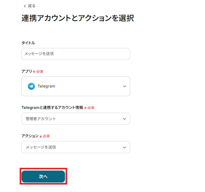 (2)Telegramと連携するアカウント情報を任意で設定し、アクションはテンプレート通りに「メッセージを送信」のまま「次へ」をクリックして進んでください。