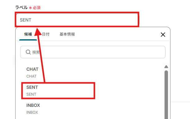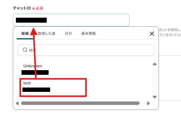 「候補」から連携したアカウント内にあるチャットの一覧が表示されるので、対象のチャットを選択しましょう。