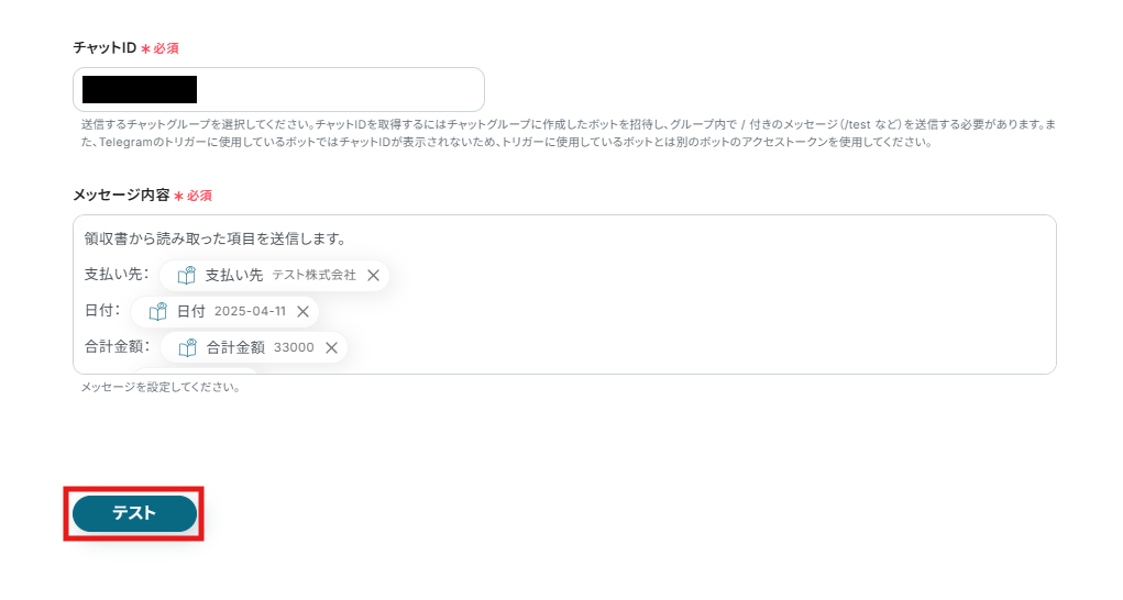(3)「チャットID」にステップ4で読み取った文章を送信したいチャットIDを入力します。