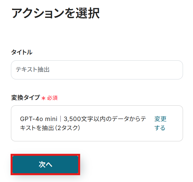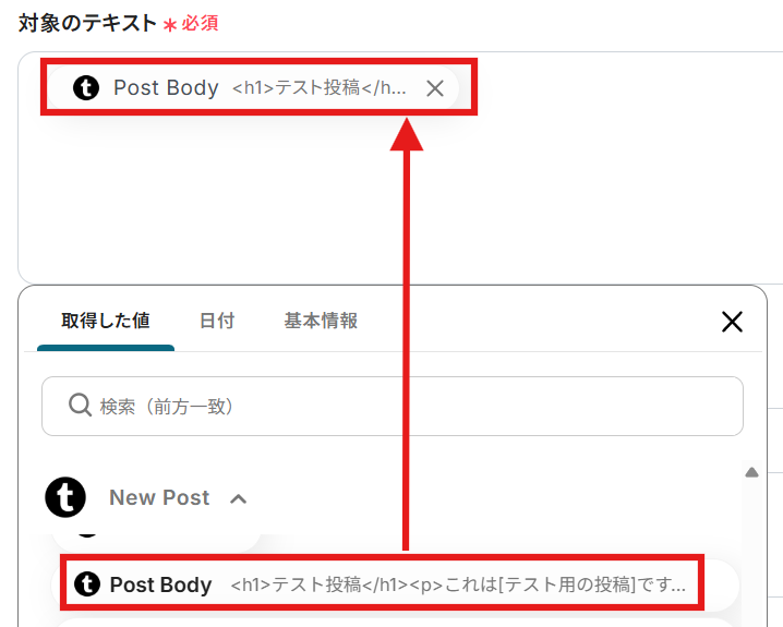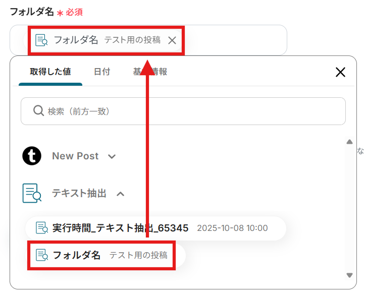 入力欄をクリックすると表示される選択肢の中から、先ほど「テキスト抽出」で取得した値を選びましょう。