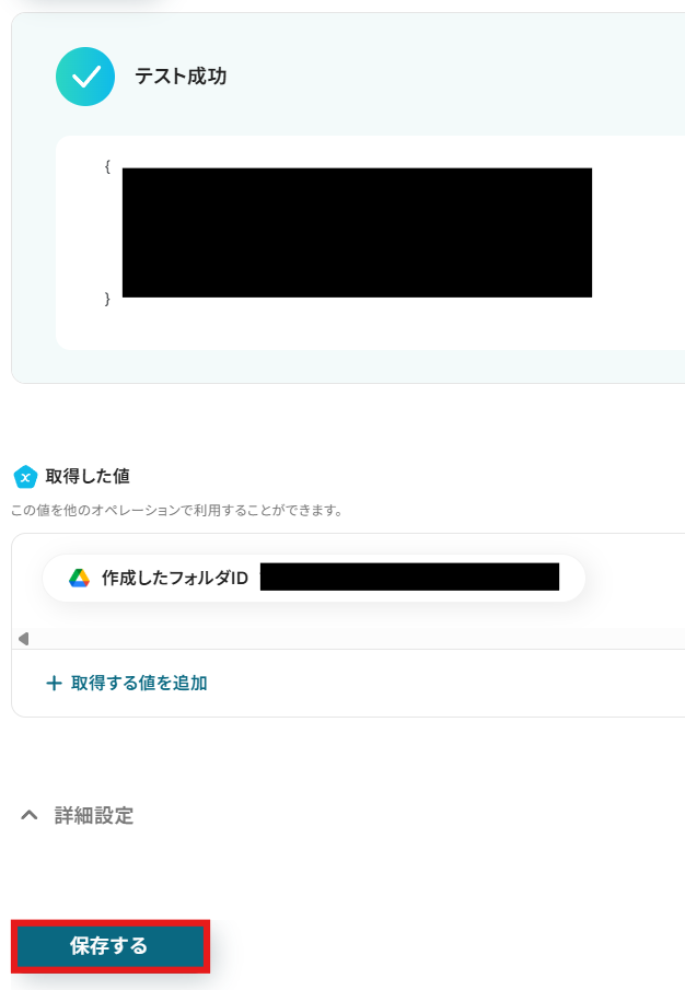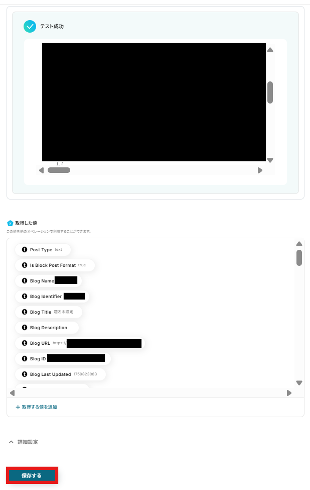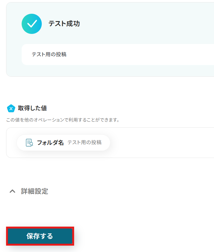 テストが成功じ、取得した値が表示されたら「保存する」をクリックして次へ進みましょう。