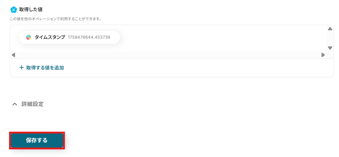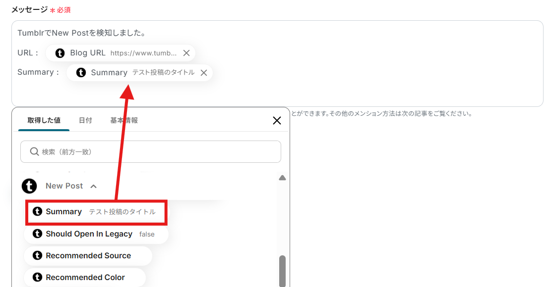・メッセージ:任意のメッセージを入力します。以下のように①で取得した値を埋め込むことも可能です。(アウトプットを埋め込む)