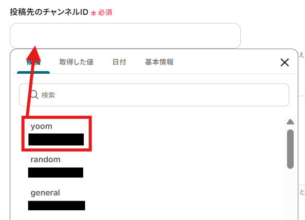 ・投稿先のチャンネルID:欄をクリックし、表示された候補から送付したいチャンネルを選択します。