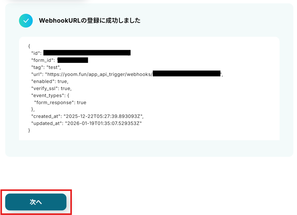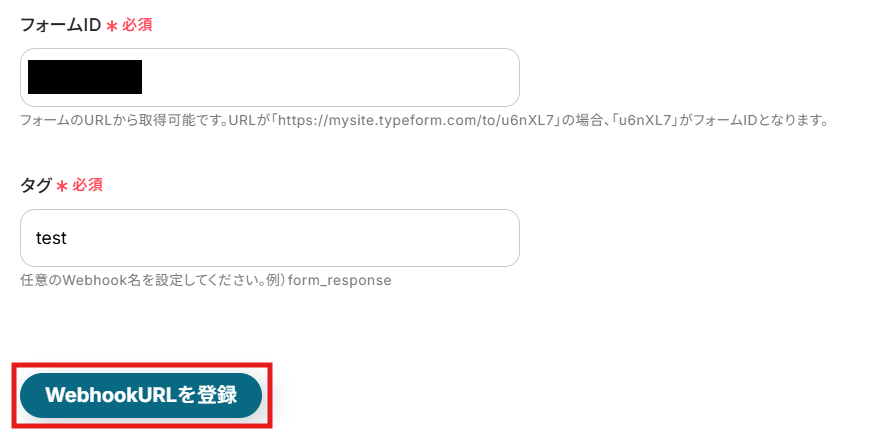 フォームIDとタグの入力が完了したら、「Webhook URLを登録」をクリックします。