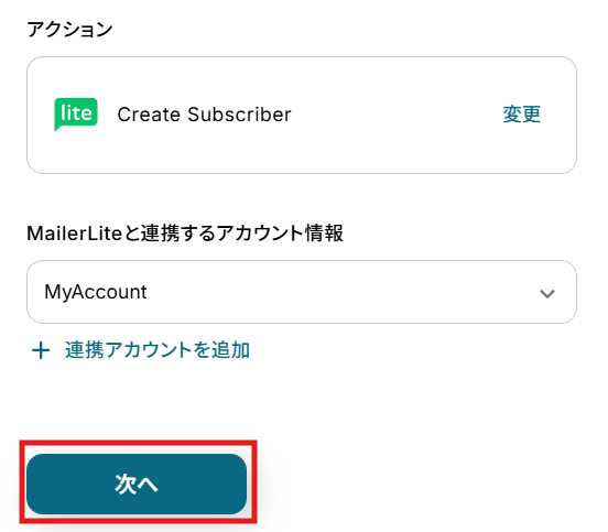 - 最後に、オペレーションでMailerLiteを選択し、「Create Subscriber」アクションを設定します。