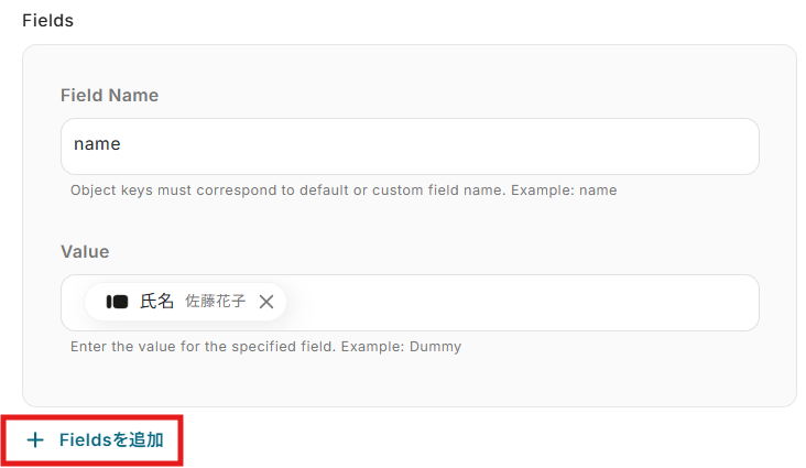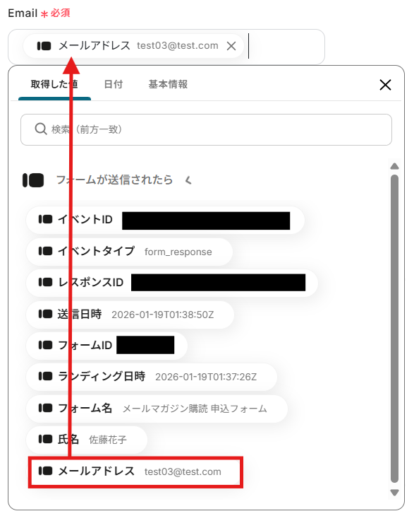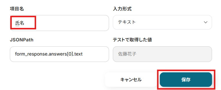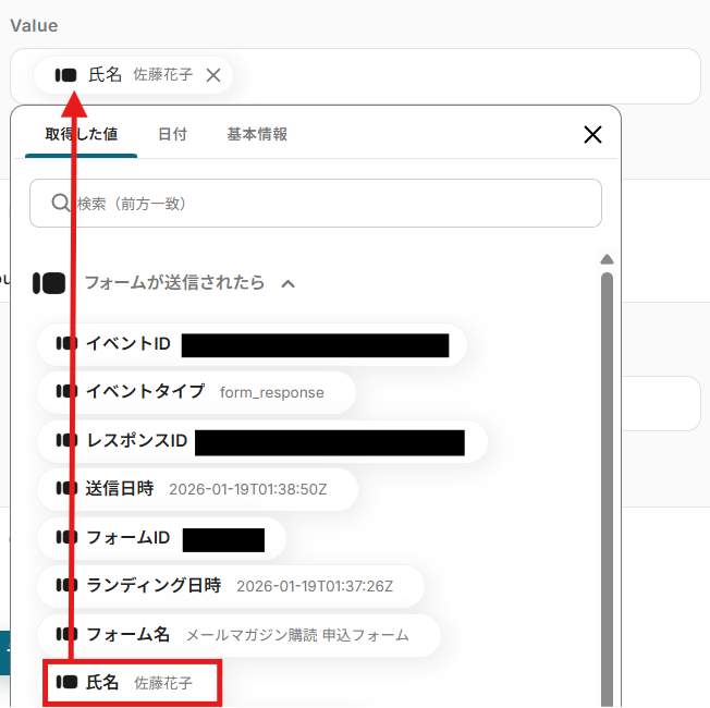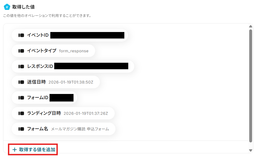 - Typeformの回答内容を取得する方法は「『取得する値』を追加する方法」をご参照ください。