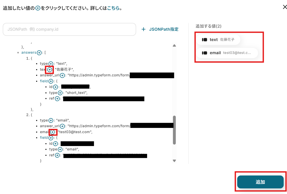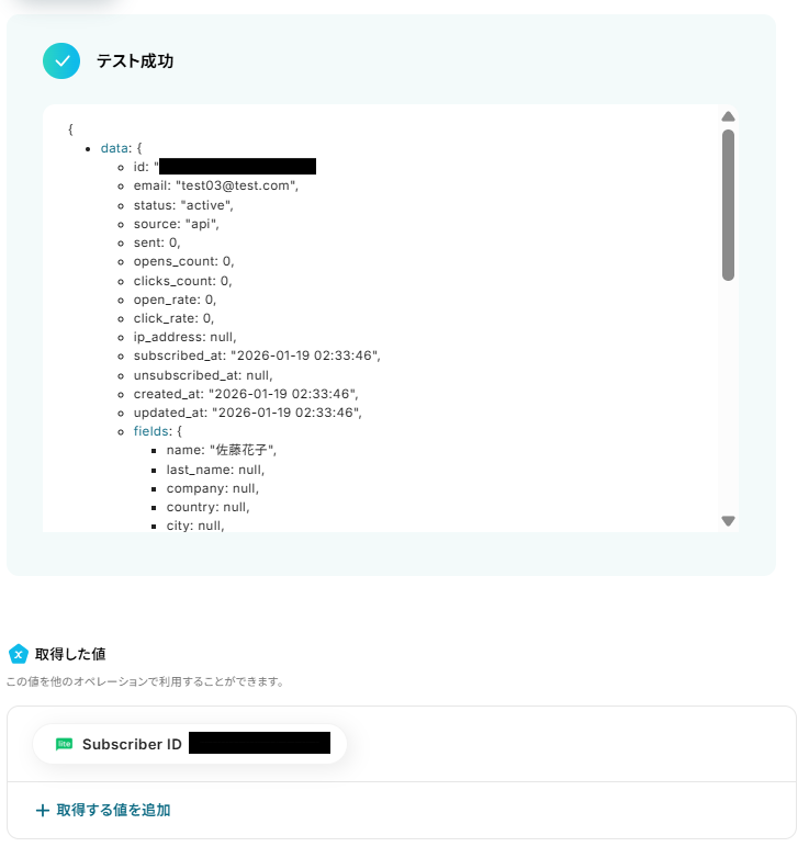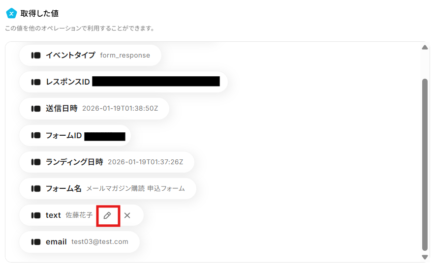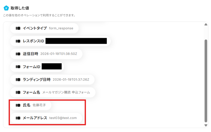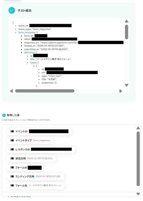 テストが成功すると、取得した値の横にTypeformのフォームに送信した回答内容が表示されます。