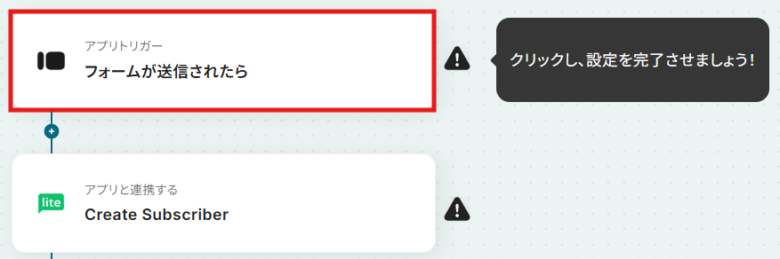 - 次に、トリガーでMailerLiteを選択し、「Subscriber Created」アクションを設定します。これにより、MailerLiteに新しい購読者が追加された際にフローが起動します。