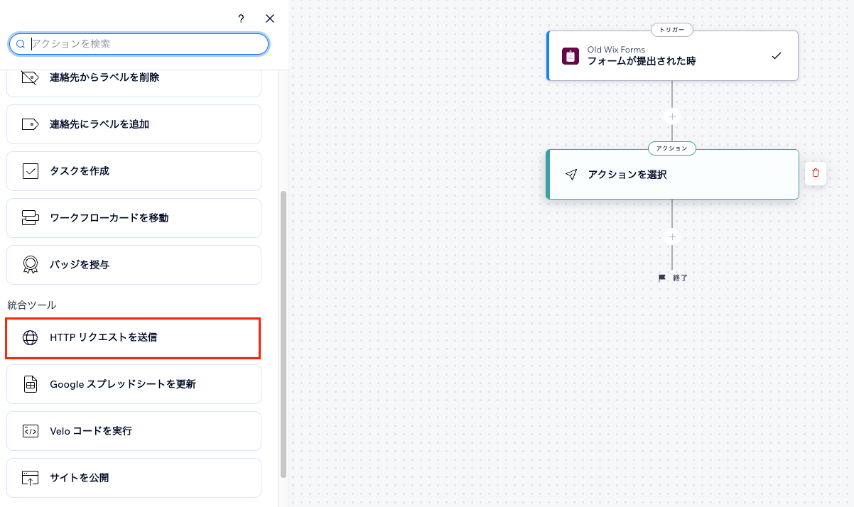 トリガー選択のOld Wix Formsから「フォームが提出された時」を選択します。