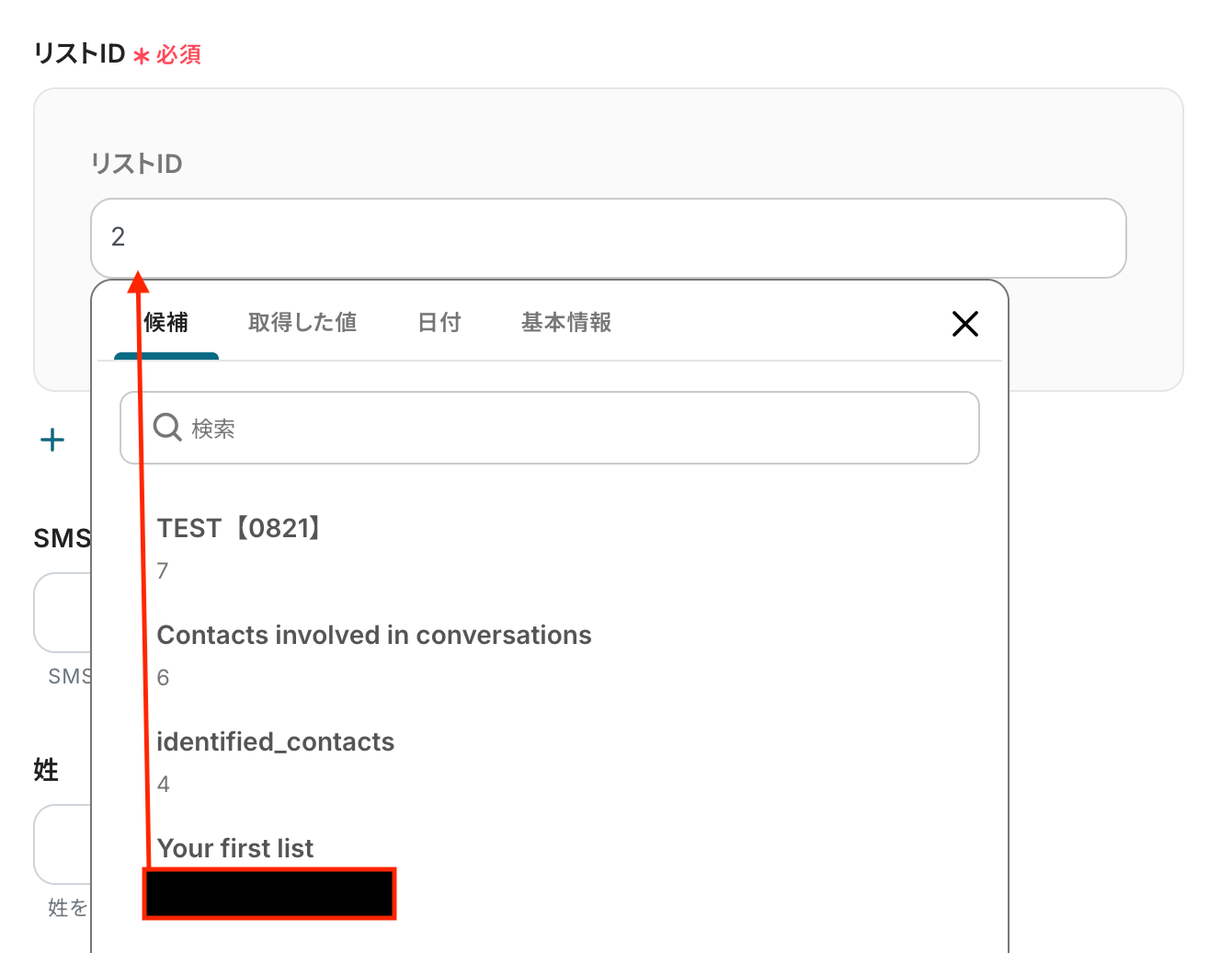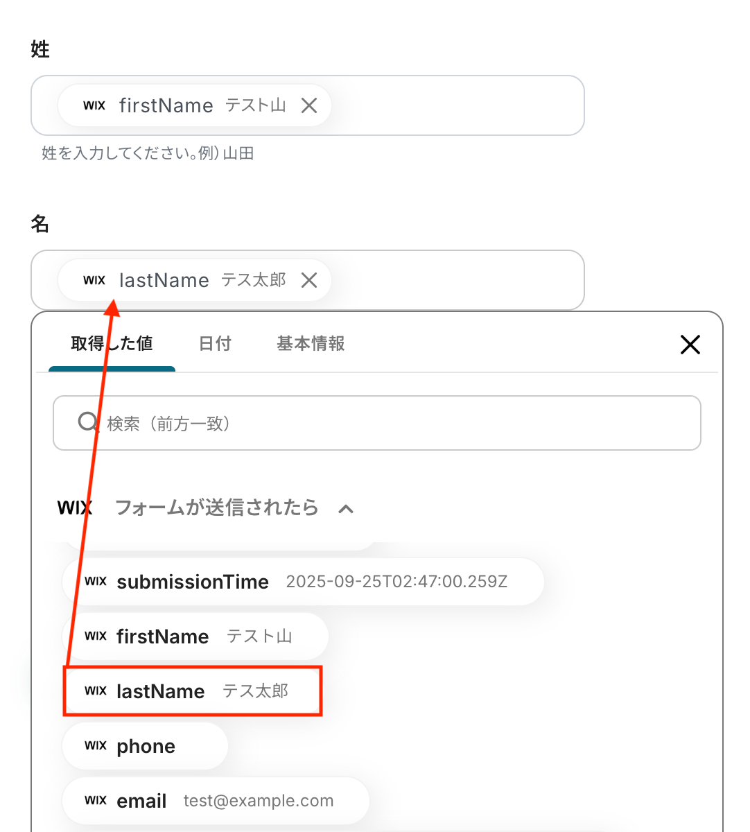 入力欄をクリックすると、前のステップでWixから取得した値が表示されるので、選択して入力しましょう。