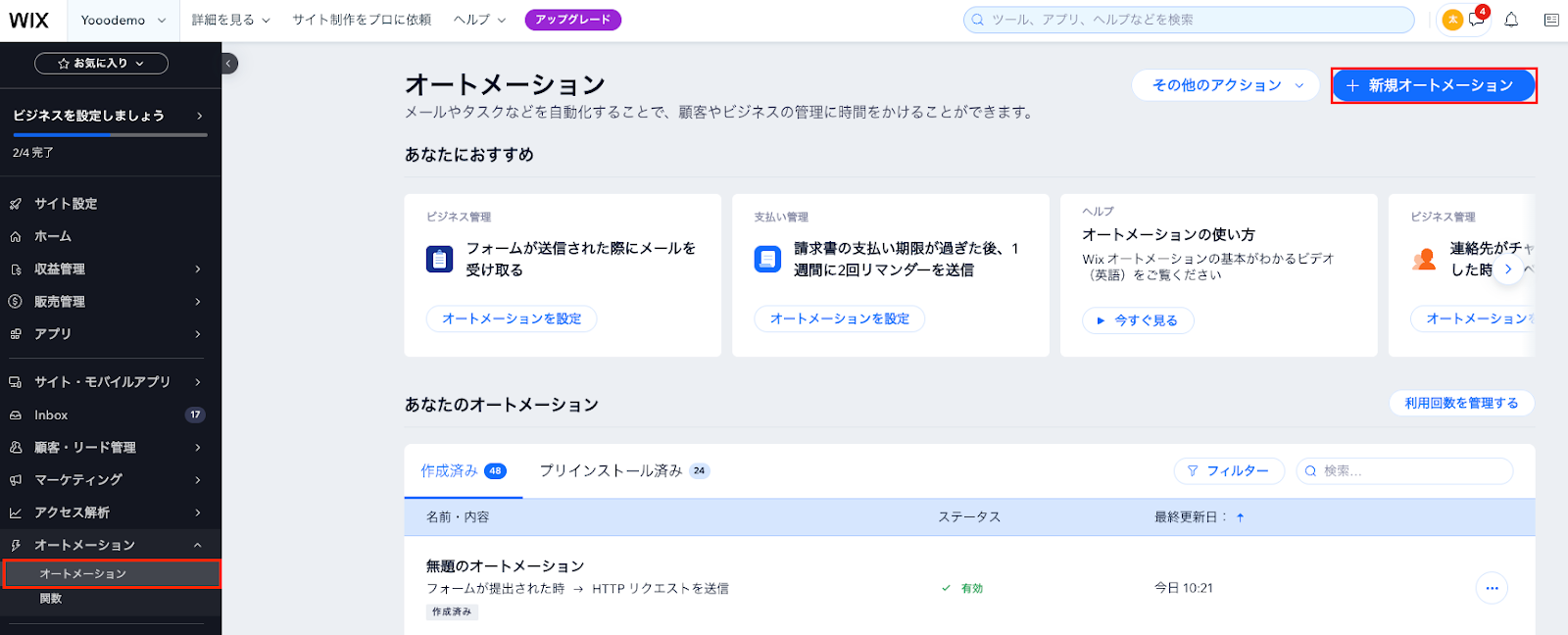 今回はWixのフォーム回答をトリガーにしたいため、Wixのオートメーション機能で設定を行いましょう。
